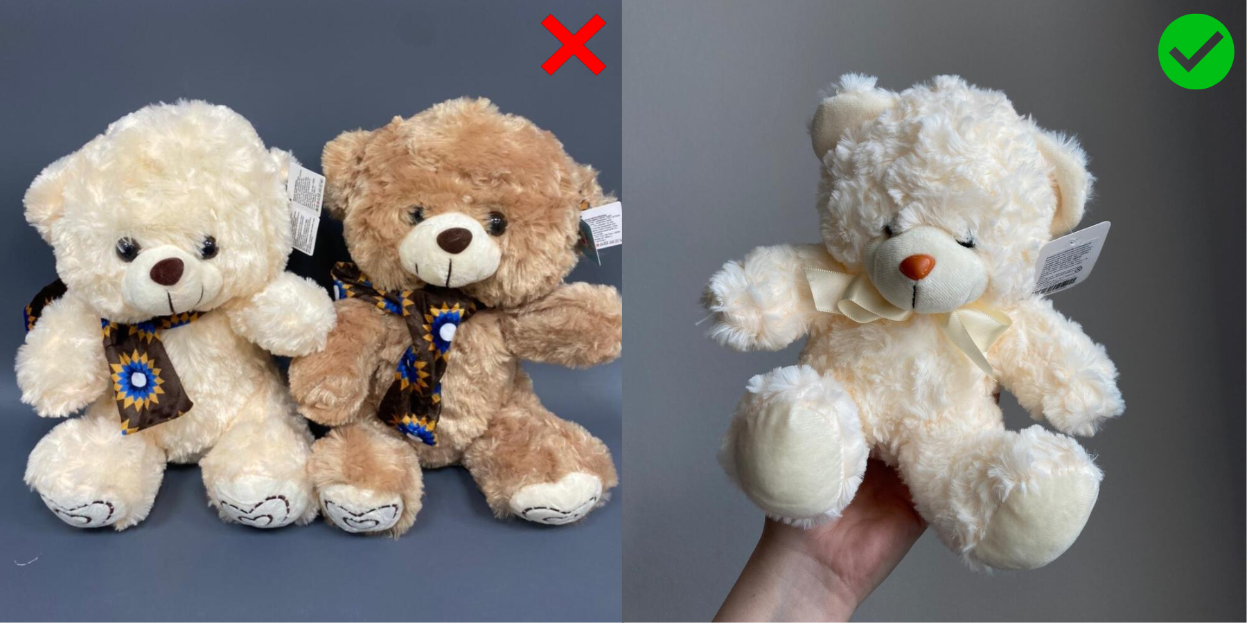 На первом фото представлены сразу две расцветки товара, что может запутать покупателя. Для каждой расцветки или отличающейся формы товара нужно создать отдельную карточку